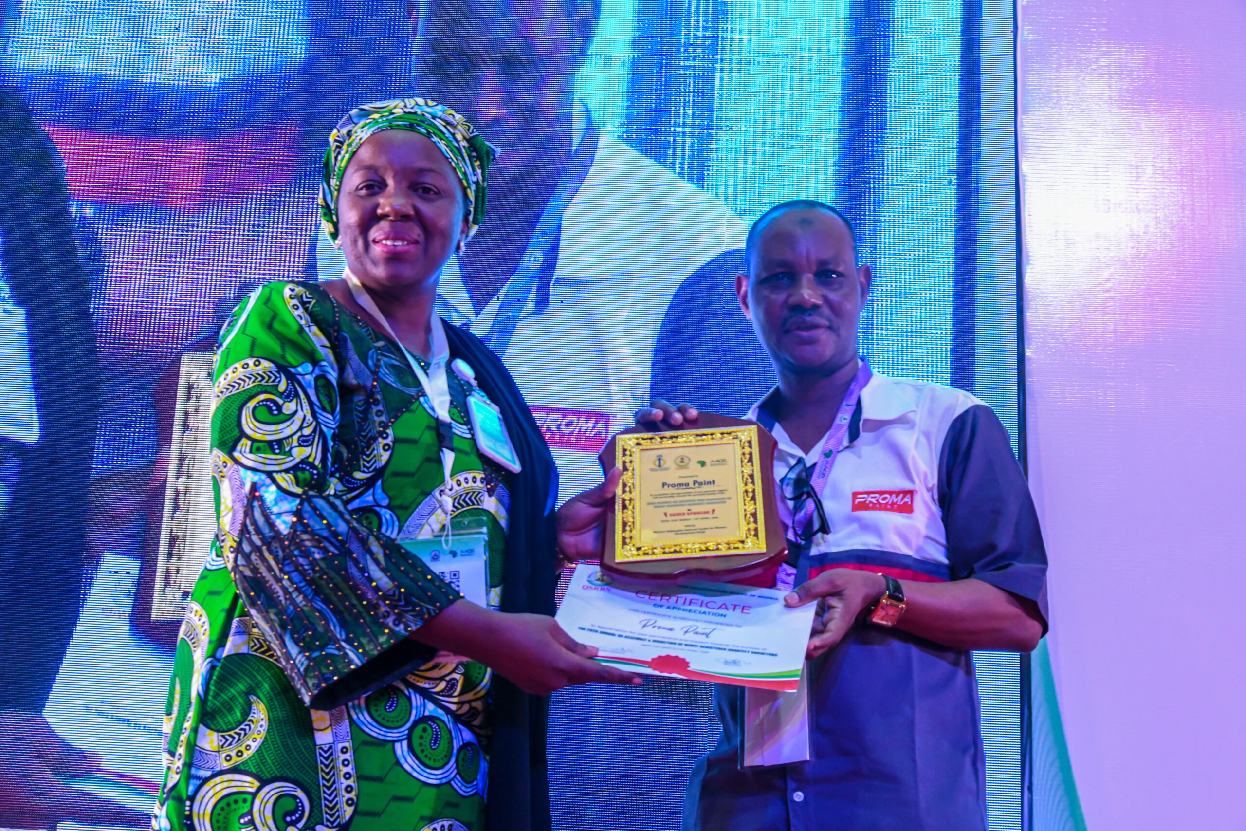 QSRBN Registrar giving a plaque award to Proma Paint