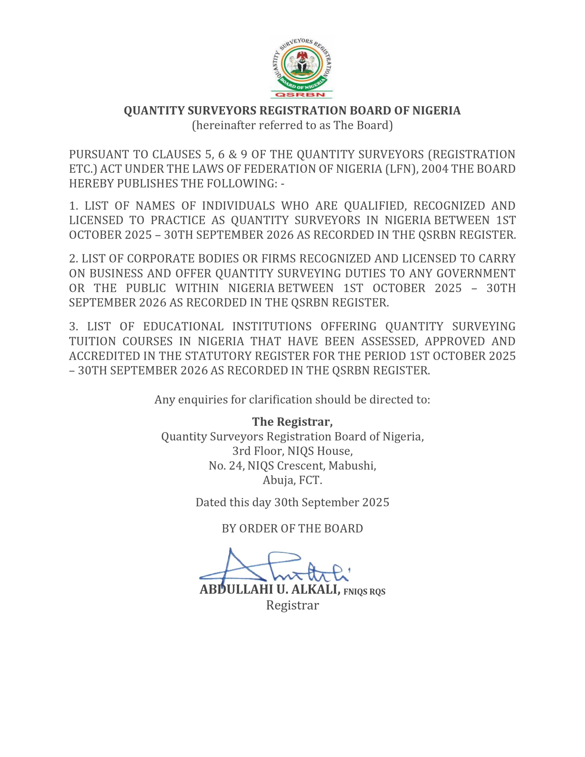 QSRBN is legally empowered to register individuals and firms authorised to practice Quantity Surveying in Nigeria.
